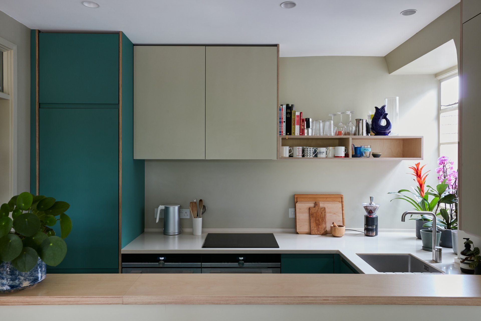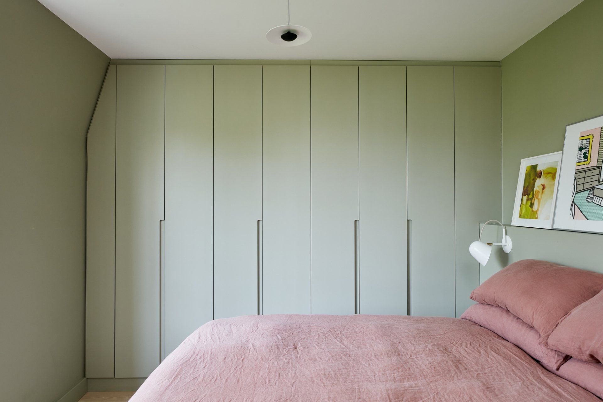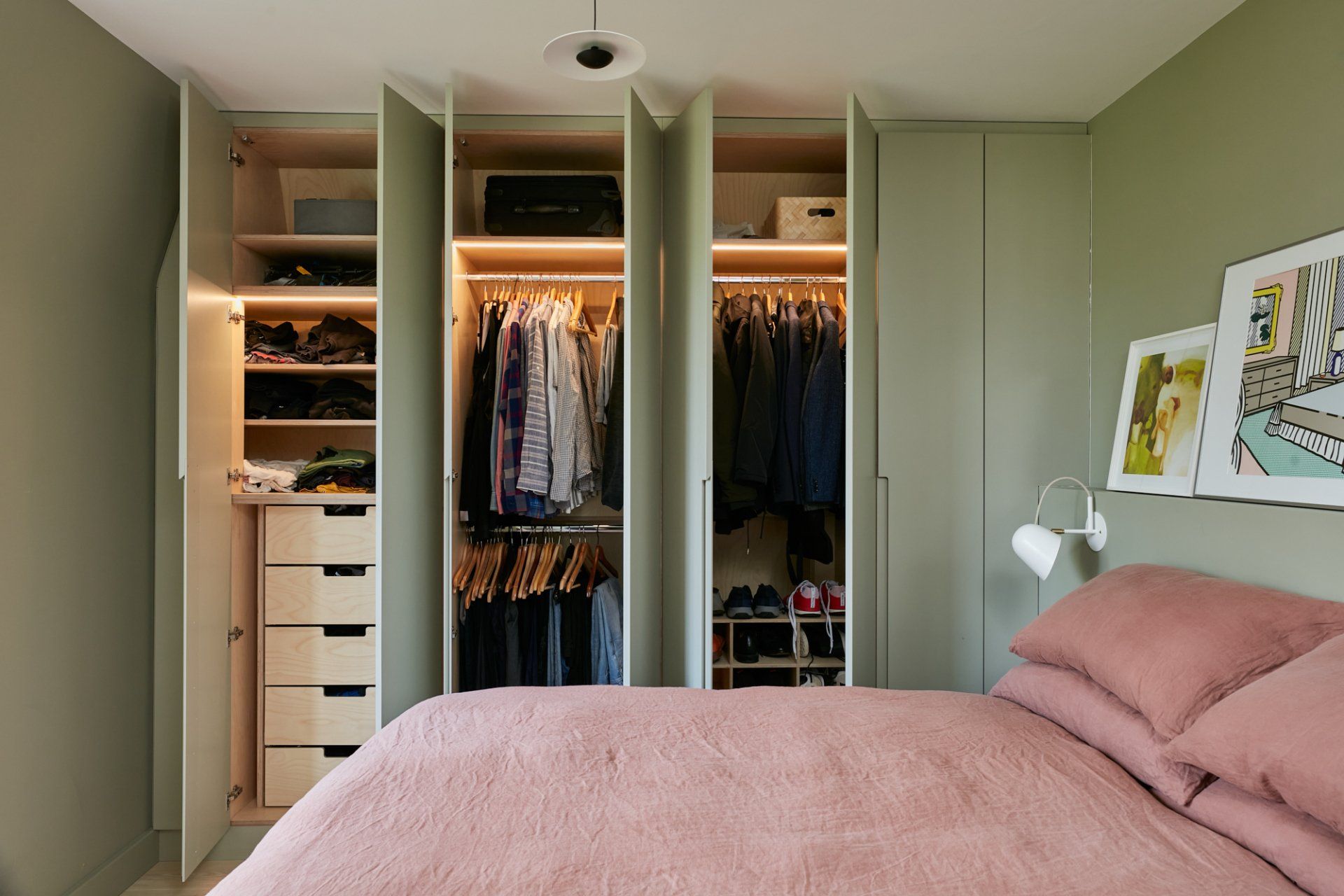 Fenix laminate is used for the majority of the kitchen fronts, contrasting with the exposed birch plywood edge and finished off with Corian worktops. The office area is made from plywood with extra deep drawers and a customised pull-out folder system. It also has a desk area with Forbo top and external faces painted in a Farrow and Ball finish. In the bedroom we created a full wall of wardrobes and storage, including various drawers, shoe storage areas and door-activated internal lighting.