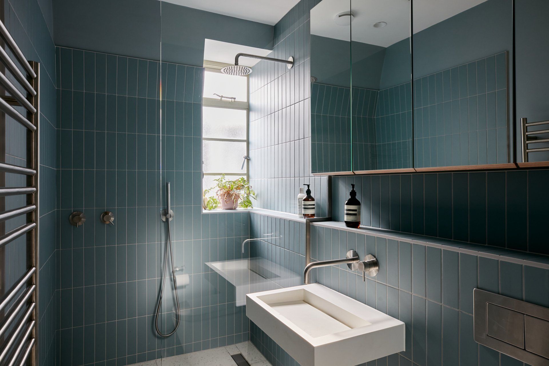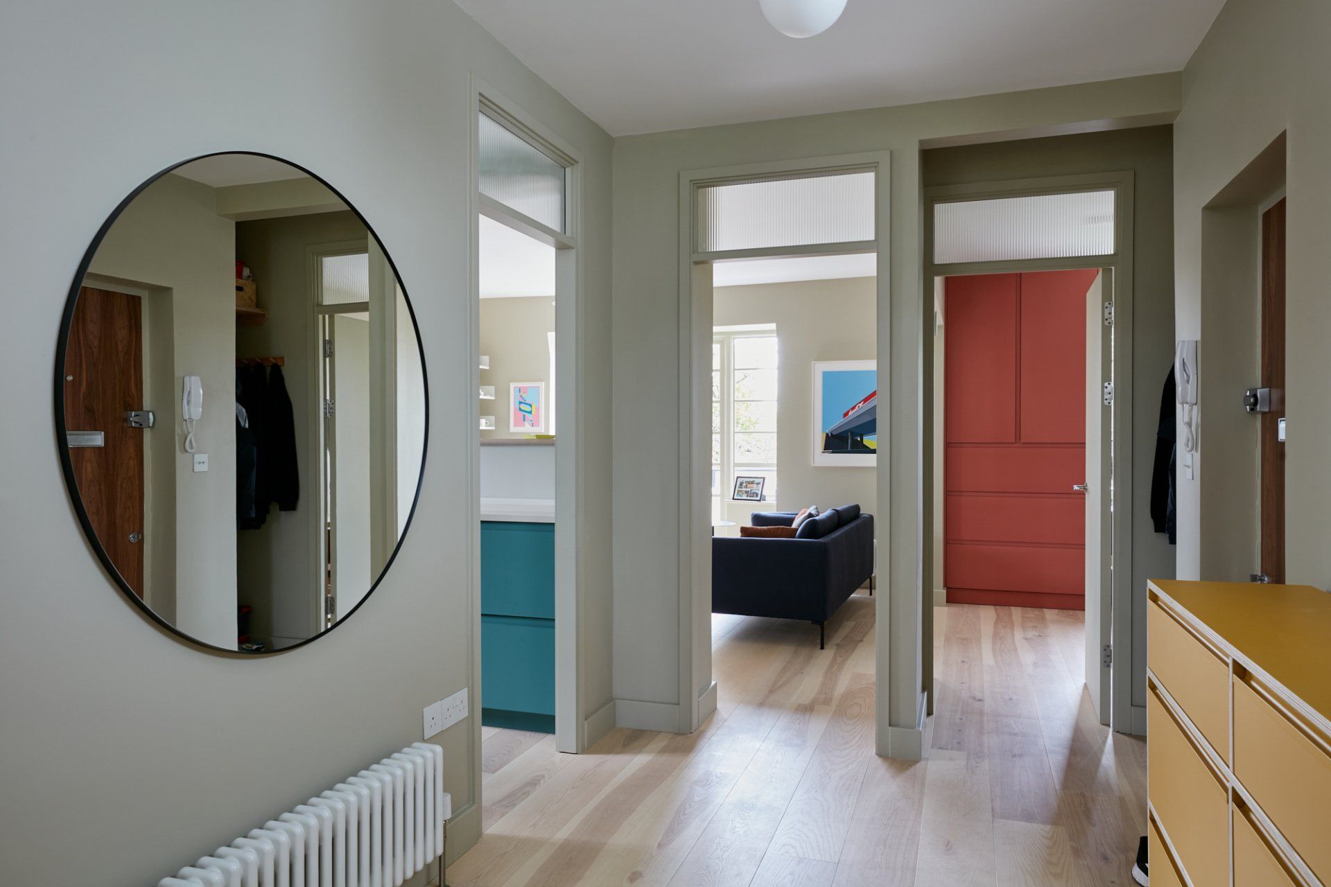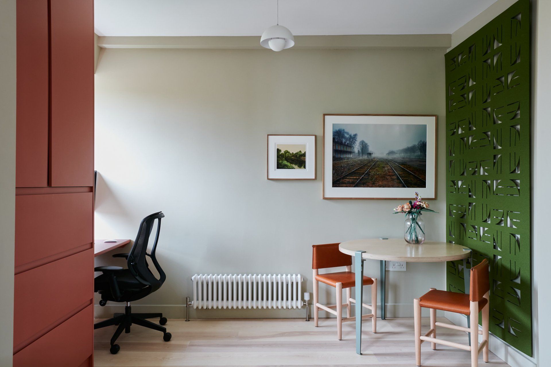 Fenix laminate is used for the majority of the kitchen fronts, contrasting with the exposed birch plywood edge and finished off with Corian worktops. The office area is made from plywood with extra deep drawers and a customised pull-out folder system. It also has a desk area with Forbo top and external faces painted in a Farrow and Ball finish. In the bedroom we created a full wall of wardrobes and storage, including various drawers, shoe storage areas and door-activated internal lighting.