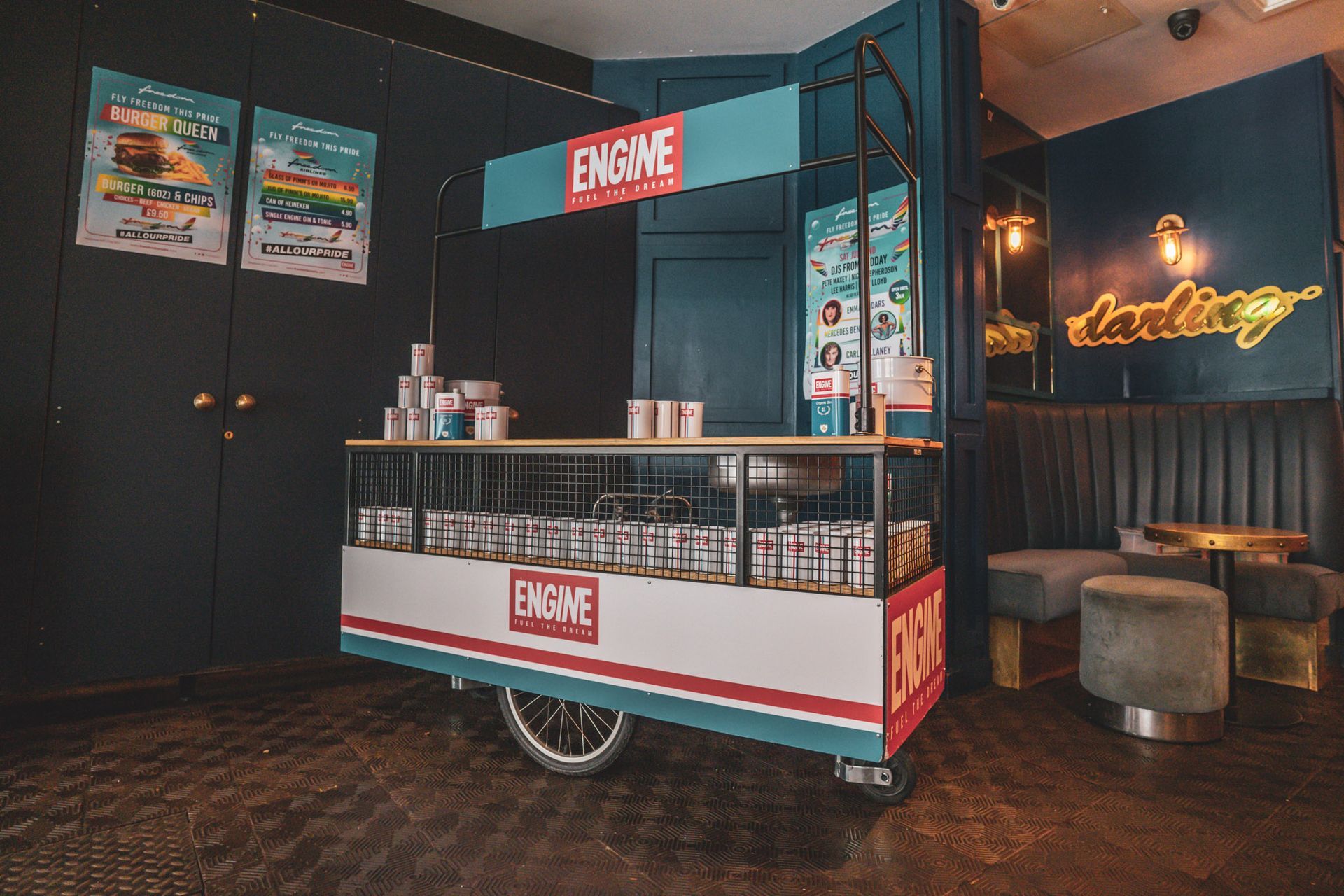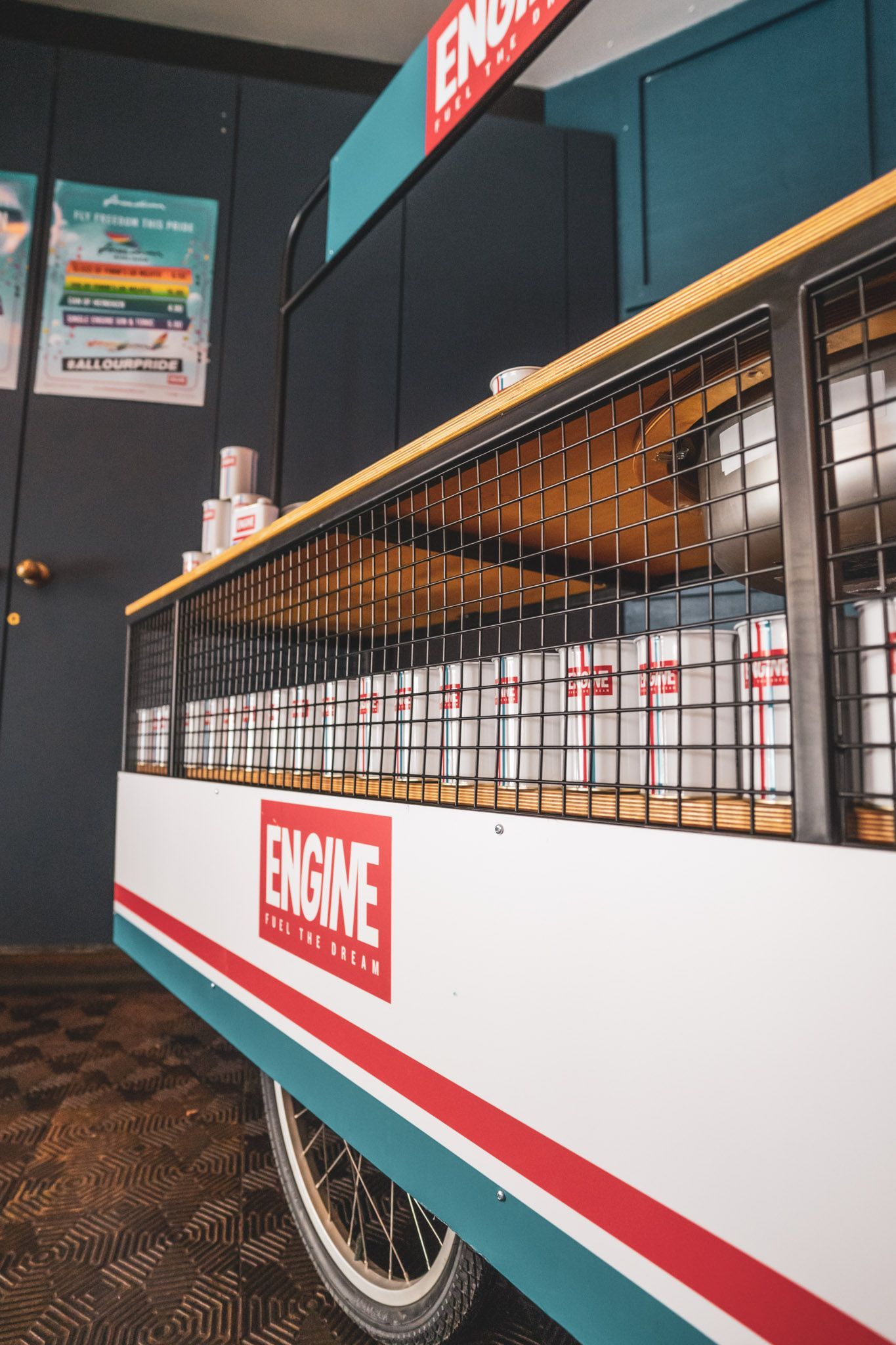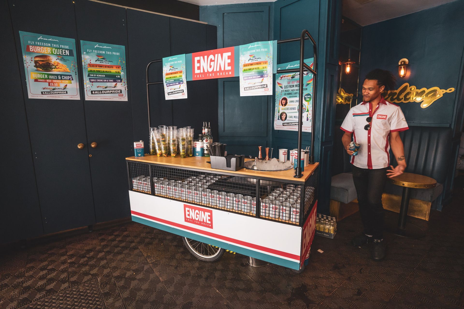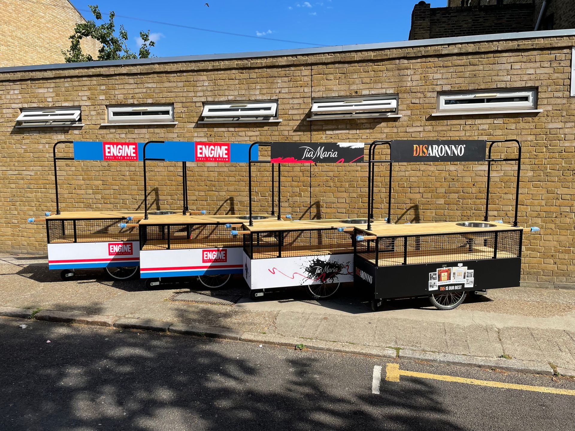 As seen at the Silverstone Grand Prix, Henley Regatta and various other UK events, our drinks carts are a versatile solution to activating drinks brands at events whilst remaining manouverable and providing strong brand identity. The branded panels are interchangeable, enabling the trolleys to be adapted for custom events and tailored for different drink brands. The lower shelf provides a large storage space which doubles as a product display. The carts also include a built-in ice sink with integrated drain to allow water to drain through the trolley without damaging products.