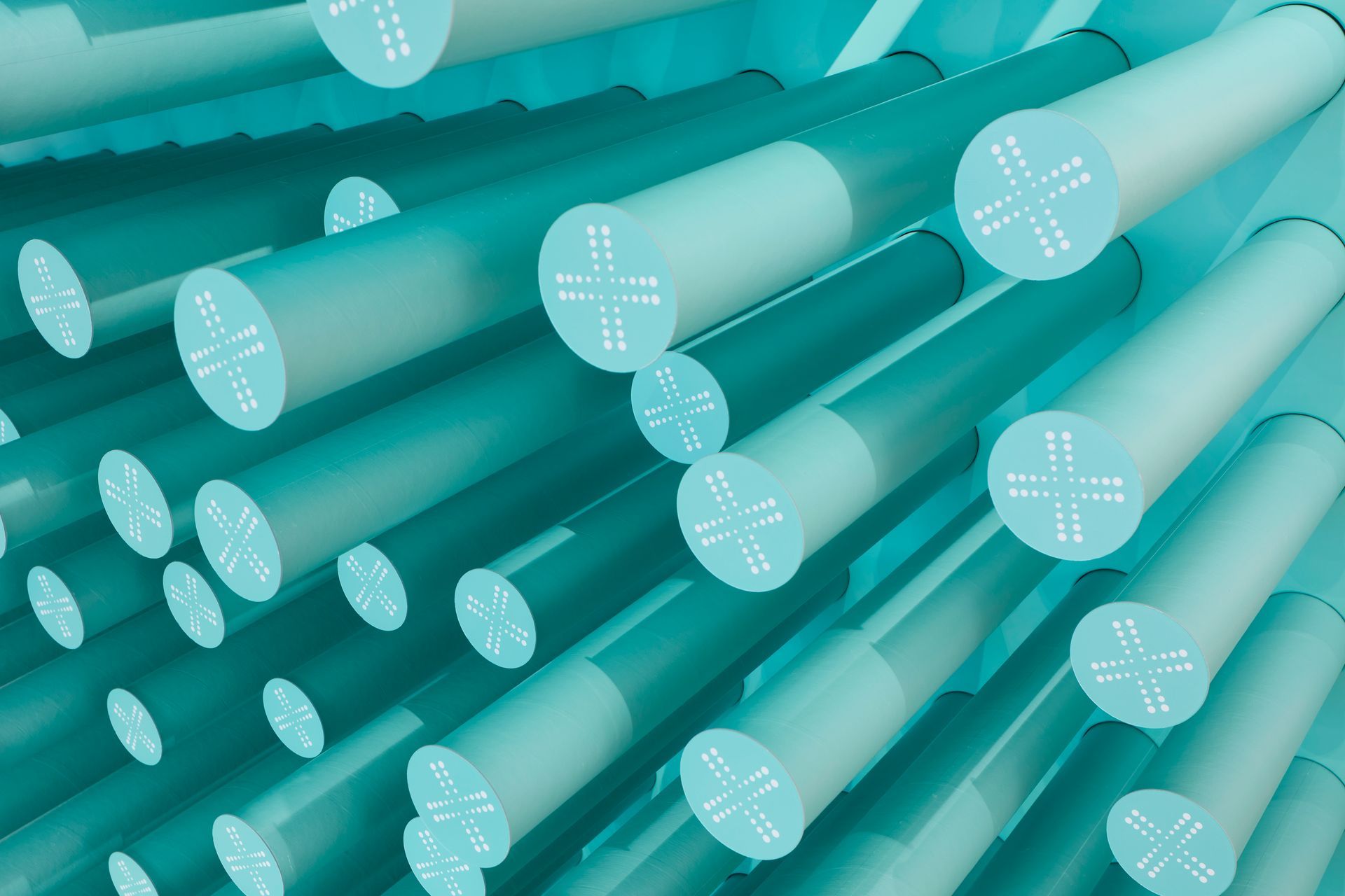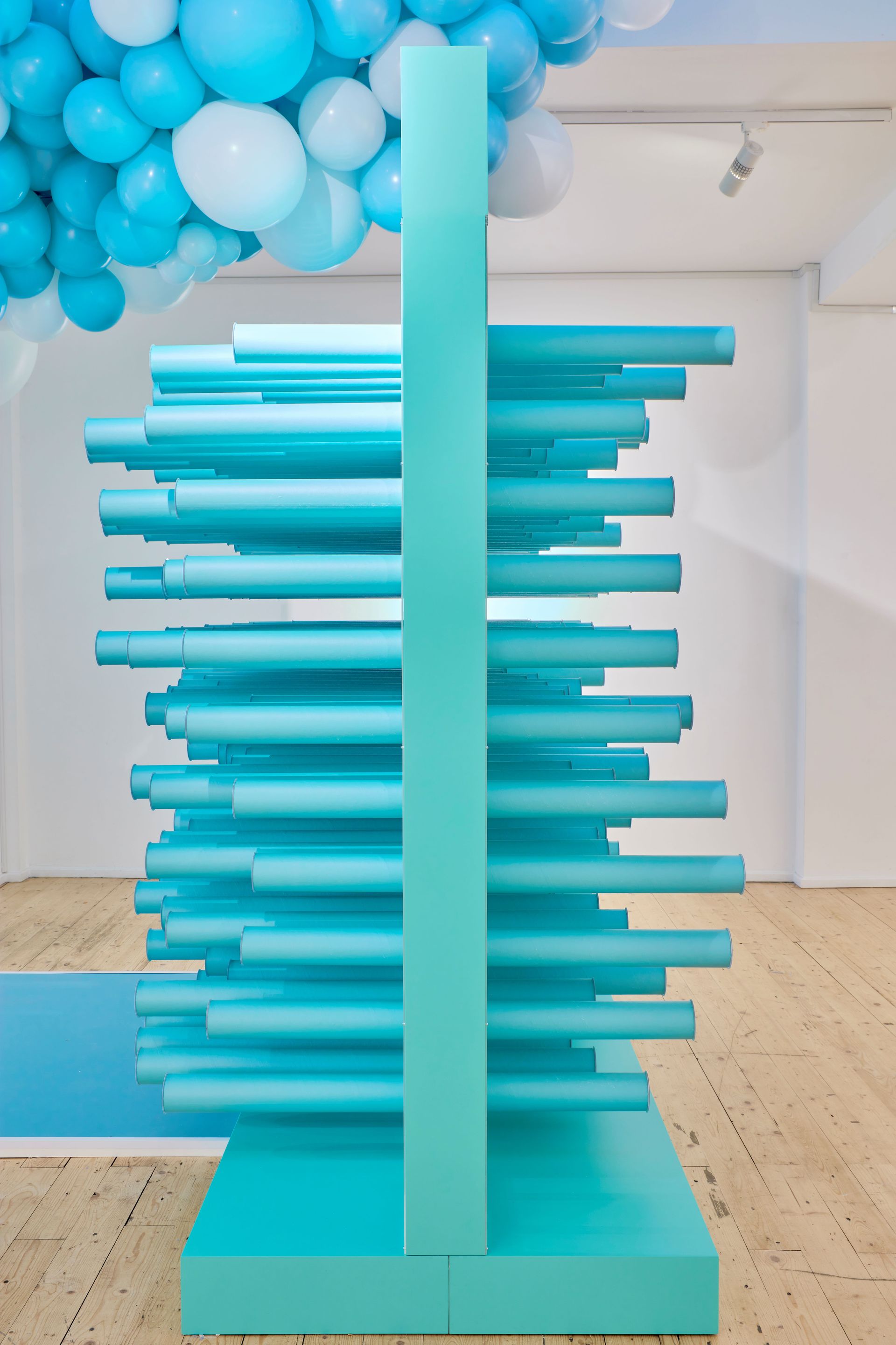 This interactive display features two product shelves either side of a huge 'pin impression art display', made of printed cardboard tubes. Customers were encouraged to create patterns in the wall and take pictures with it. Elsewhere the popup included custom stools, desks and displays as well as custom vinyl signage throughout. A bespoke runway finished off the space, providing a directive for customers to follow and encourage interaction with the main display.
