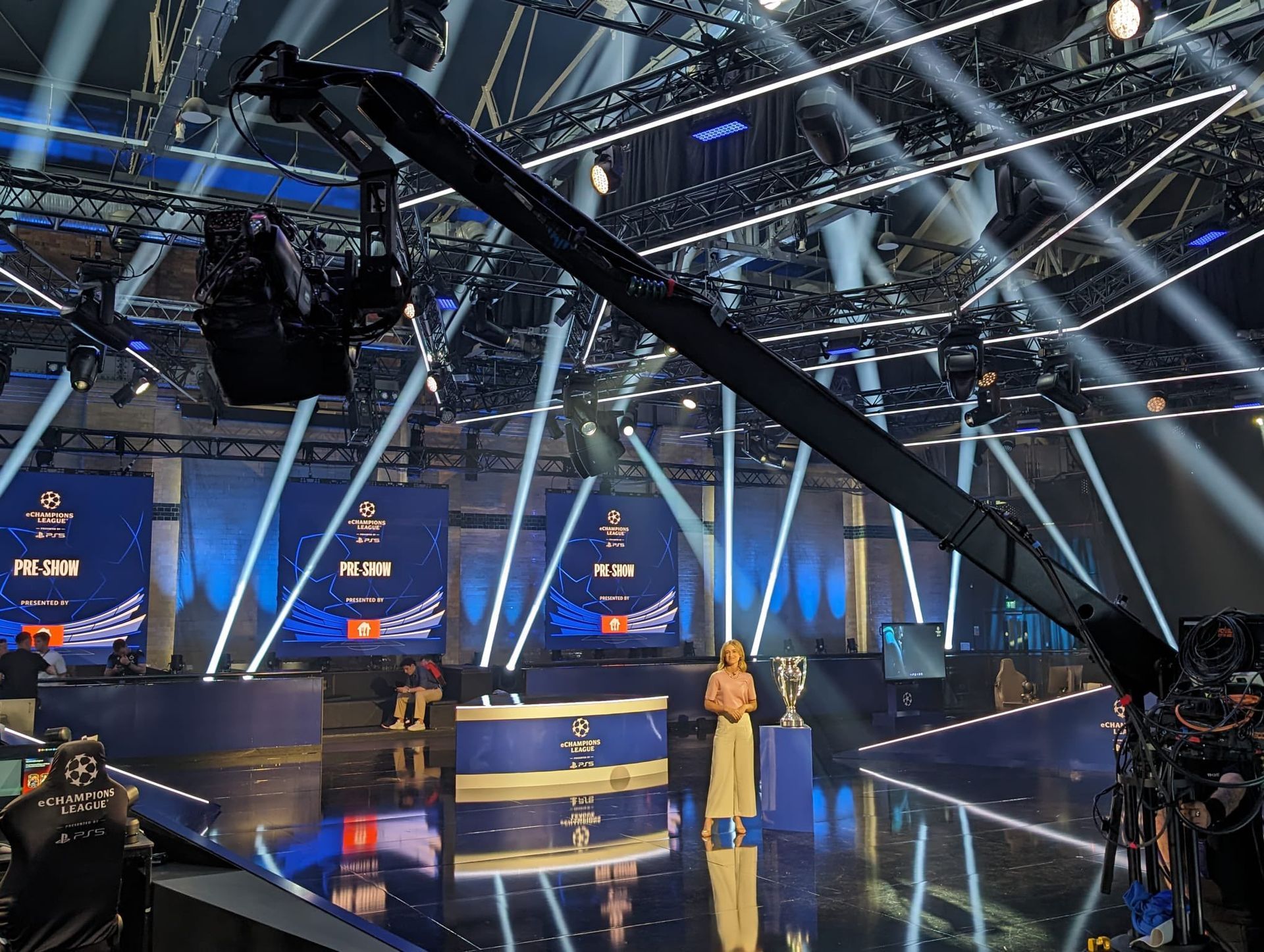 On a short schedule, the JM team built and installed the studio set, which included the staging, gaming pods and presenters desk for the EA Sports 2024 FC Pro E-Champions League.