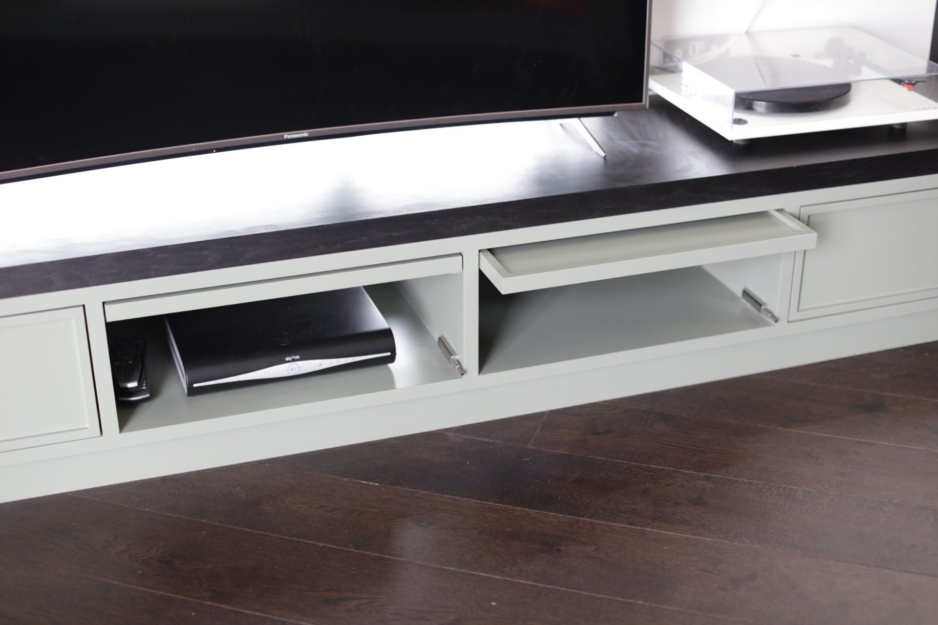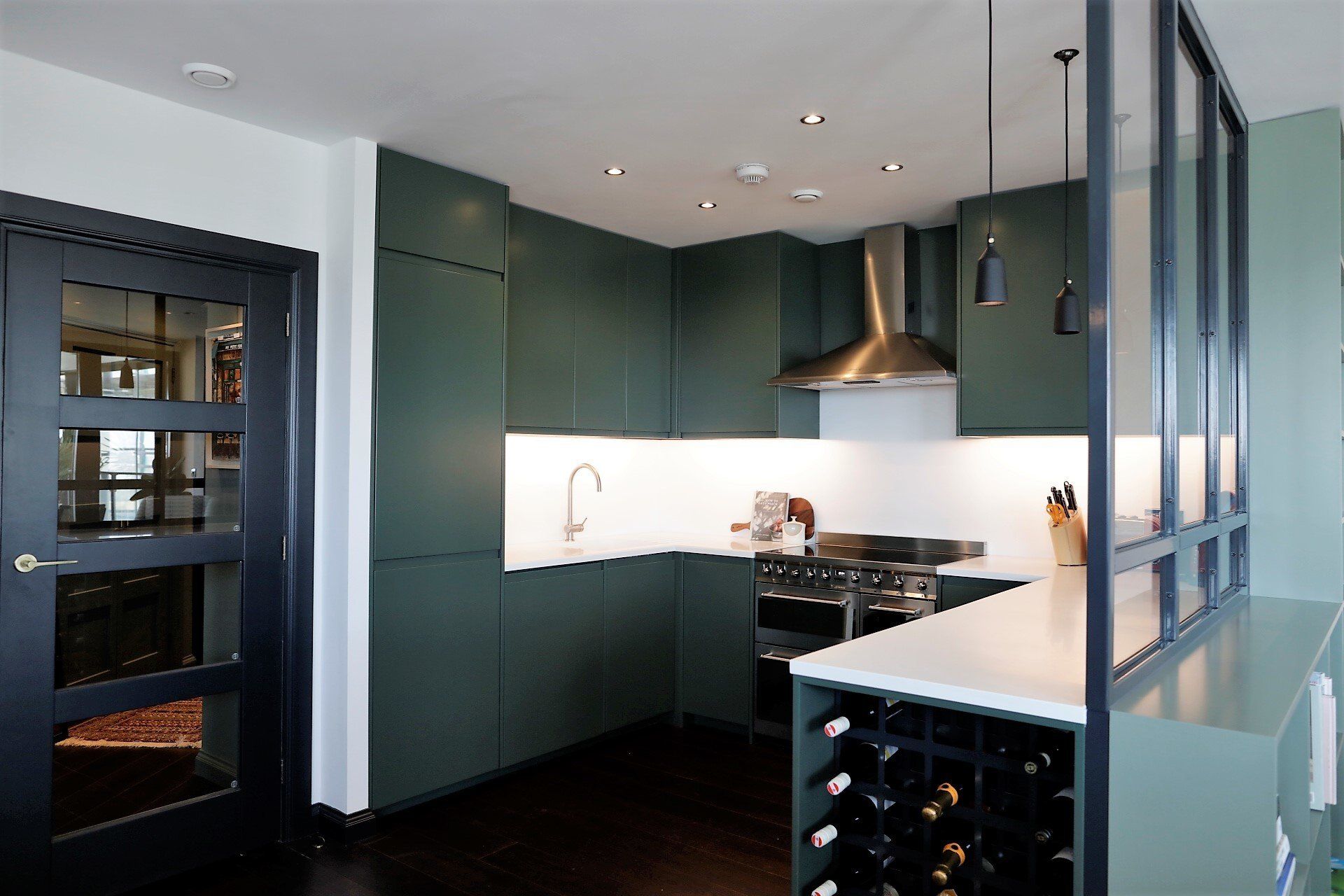 One of our largest projects was the complete refurbishment of a penthouse apartment in London. Working closely with the client and architect, we took on the role of principal contractor and managed the procurement, construction and schedule. We were presented with a standard interior and layout, which we stripped out and remodelled around the architects plans. Where required we coordinated our various subcontractors to install new electrics and plumbing along with various other trades. Alongside managing the site works we designed and manufactured the bespoke joinery items to dovetail in with the project schedule. Items included a bespoke kitchen with spray finished fronts, a corian worktop, powdercoated wine rack and a glazed screen. We also manufactured the bespoke wardrobes for the dressing rooms, floating picture rail shelves in the hallway and a TV media unit as well as various other items.