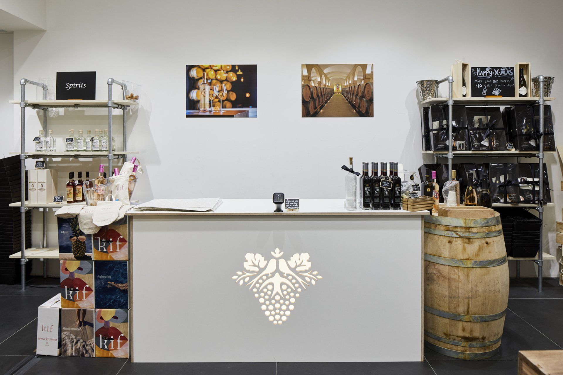 With a rustic theme we optimized the use of barrels, crates and pallets already involved with the wine making process and added bespoke shelving and displays to showcase the wine.